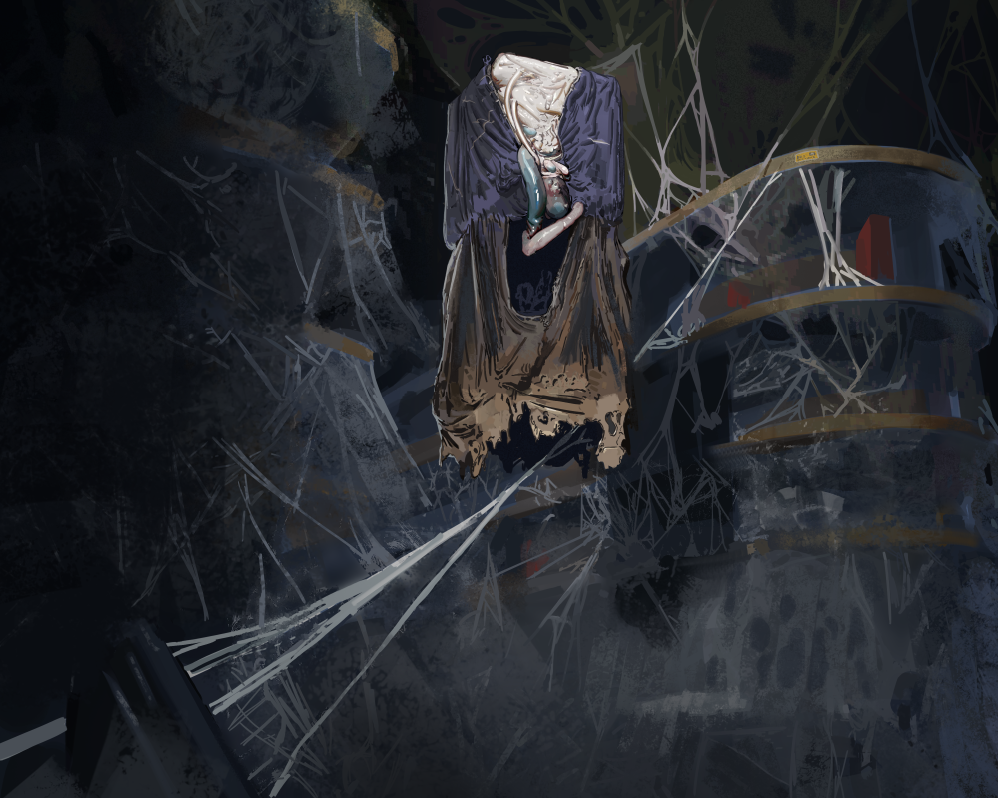 Like you put a person through a trash compactor, right? Well, it's doing this shuddering thing, and I take a step closer to get a better look. I notice this awful fucking arm thing hanging off it, like an unformed limb, and it's kinda wiggling at me? Well, the things fucking nasty, so I give it a kick. And it just slides across the floor, like it's an empty box! No weight to it. But right as I kick it, it fuckin' sprays me, like a skunk. This thick, nasty-smelling cloud.