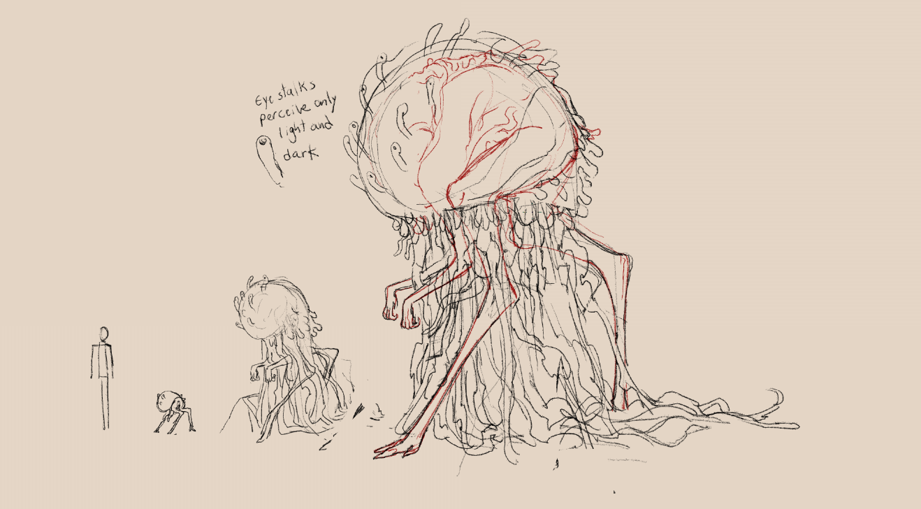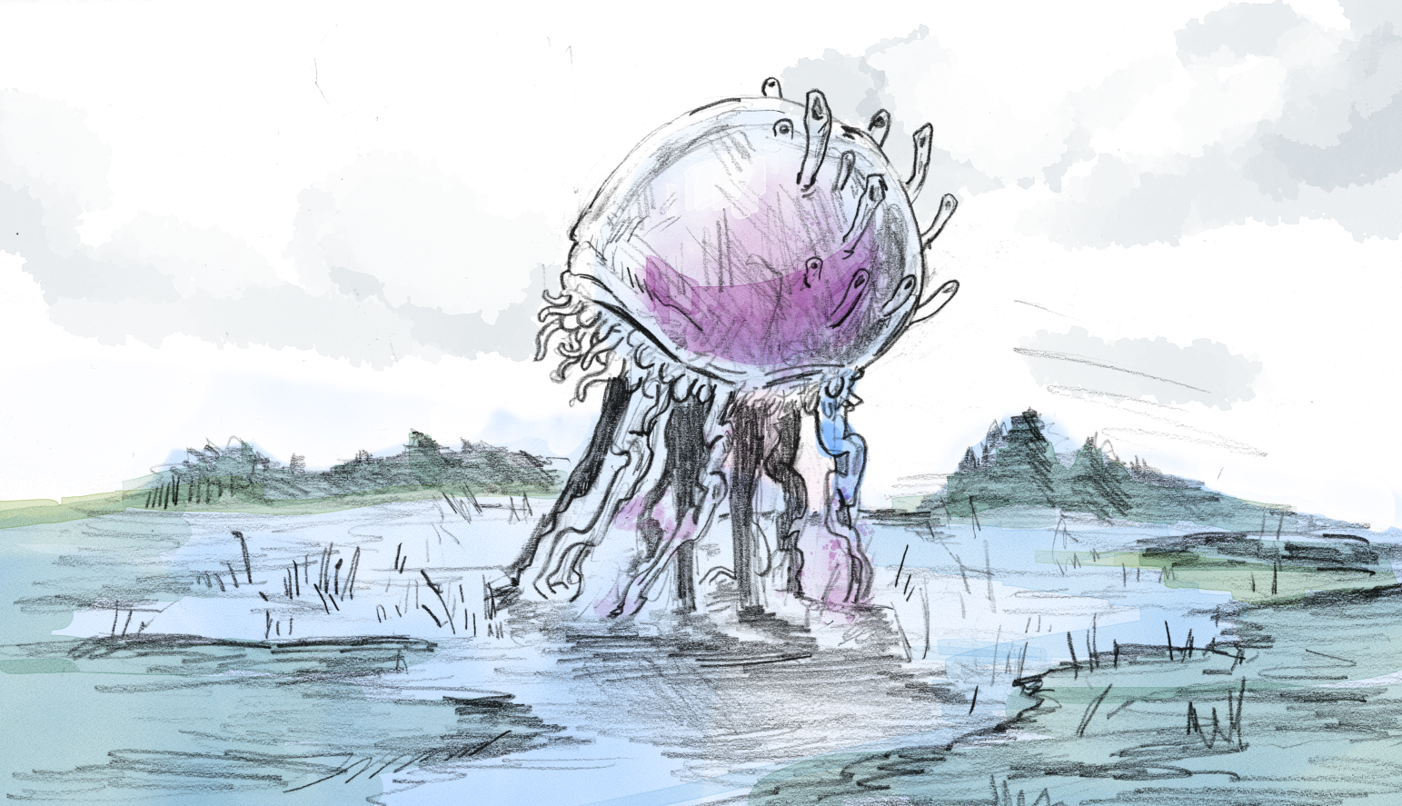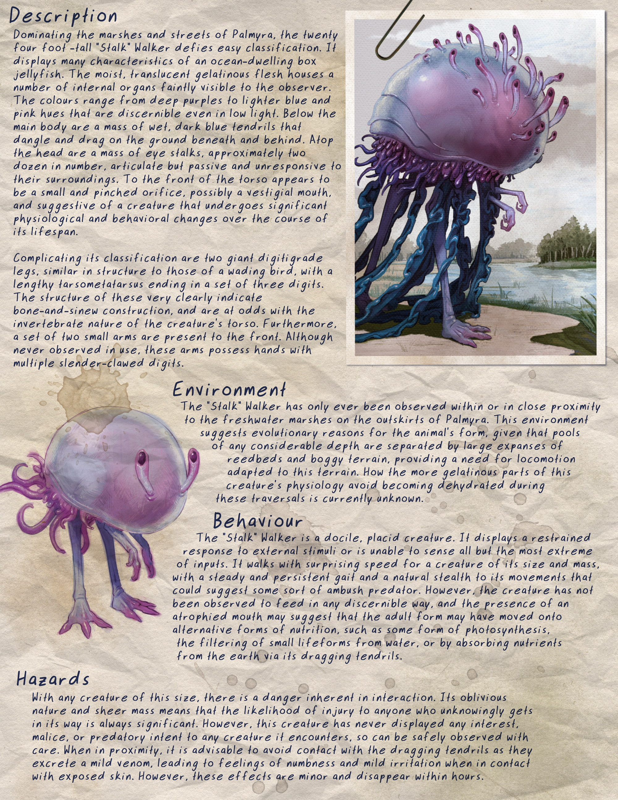 Dominating the marshes and streets of Palmyra, the 20ft-tall “Stalk” Walker defies easy classification. It displays many characteristics of an ocean-dwelling box jellyfish. The moist, translucent gelatinous flesh houses a number of internal organs faintly visible to the observer. The colours range from deep purples to lighter blue and pink hues that are discernible even in low light. Below the main body are a mass of wet, dark blue tendrils that dangle and drag on the ground beneath and behind. Atop the head are a mass of eye stalks, approximately two dozen in number, articulate but passive and unresponsive to their surroundings. To the front of the torso appears to be a small and pinched orifice, possibly a vestigial mouth, and suggestive of a creature that undergoes significant physiological and behavioral changes over the course of its lifespan.