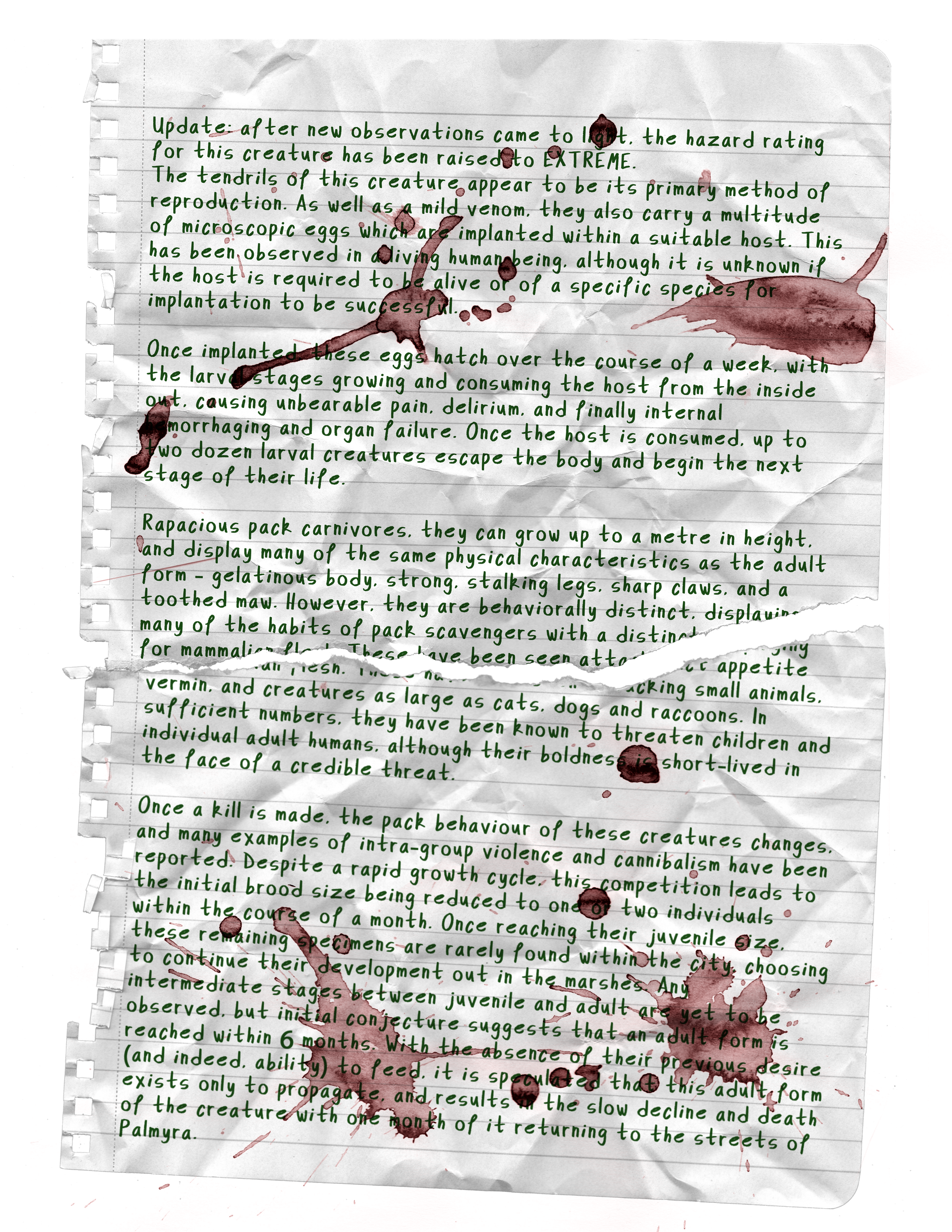 Once a kill is made, the pack behaviour of these creatures changes, and many examples of intra-group violence and cannibalism have been reported. Despite a rapid growth cycle, this competition leads to the initial brood size being reduced to one or two individuals within the course of a month. Once reaching their juvenile size, these remaining specimens are rarely found within the city, choosing to continue their development out in the marshes. Any intermediate stages between juvenile and adult are yet to be observed, but initial conjecture suggests that an adult form is reached within 6 months. With the absence of their previous desire (and indeed, ability) to feed, it is speculated that this adult form exists only to propagate, and results in the slow decline and death of the creature with one month of it returning to the streets of Palmyra.